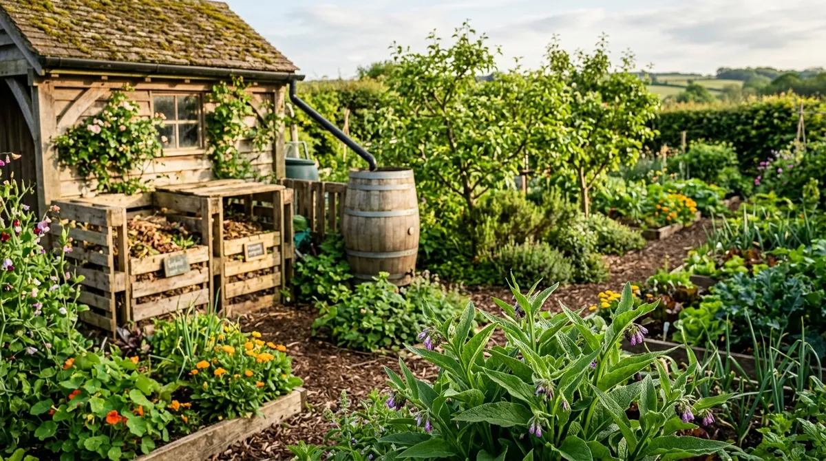 Permaculture principles applied to UK gardens. Covers the 12 design ethics, zone planning, companion planting, water harvesting, and soil building.