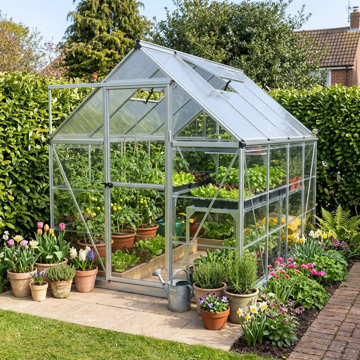 Why we recommend an 8x10ft polycarbonate greenhouse as the starting point for serious UK growers: After helping hundreds of growers choose their first greenhouse over 30 years, those who start with a 6x8ft consistently regret not going larger by their second season. An 8x10ft greenhouse holds 12-14 tomato plants and still leaves room for a propagating bench. Polycarbonate panels retain 30-40% more heat overnight than single-glazed glass, which extends the useful season by an additional 2-3 weeks compared with glass in northern UK gardens.