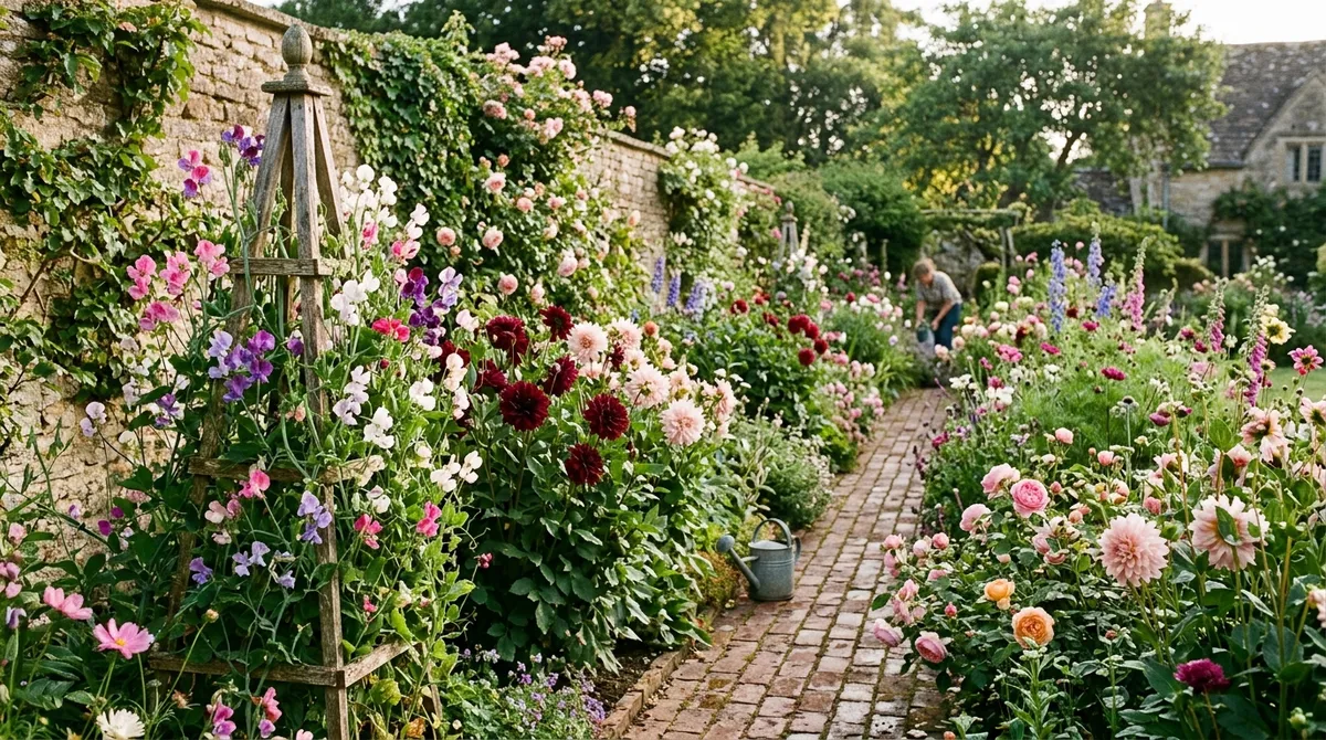 A dedicated cutting garden in full summer bloom. Sweet peas climb an obelisk while dahlias and roses line the brick path.