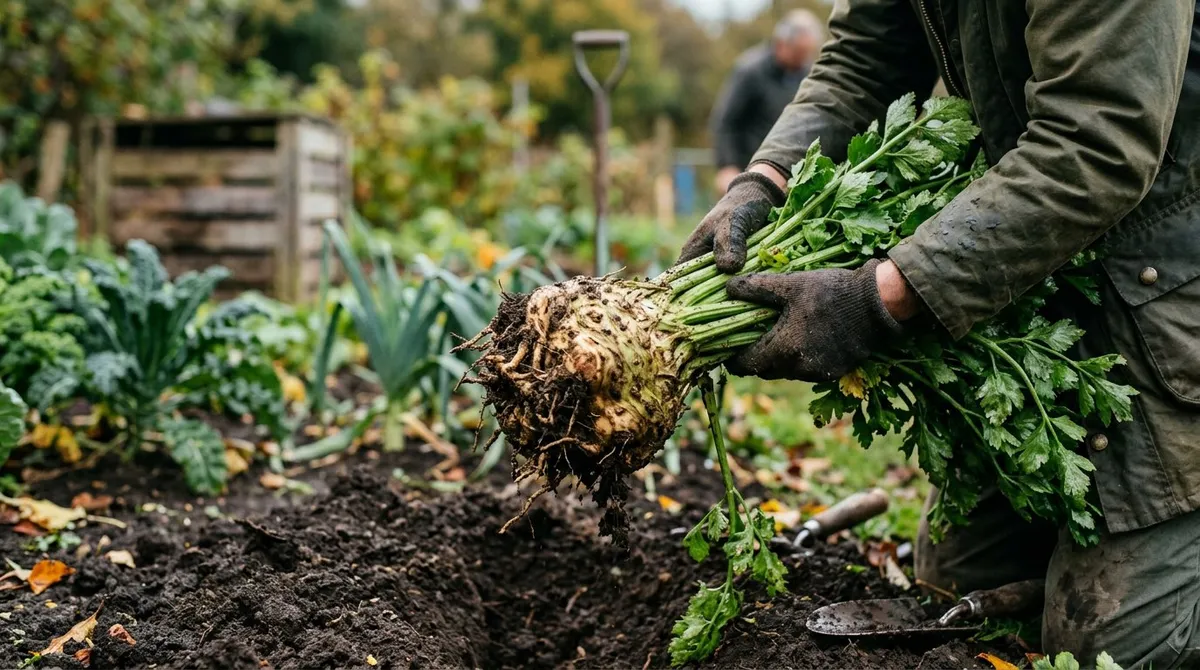 Practical guide to growing celeriac in UK gardens. Covers varieties, sowing indoors, transplanting, watering, side shoot removal, and winter storage.