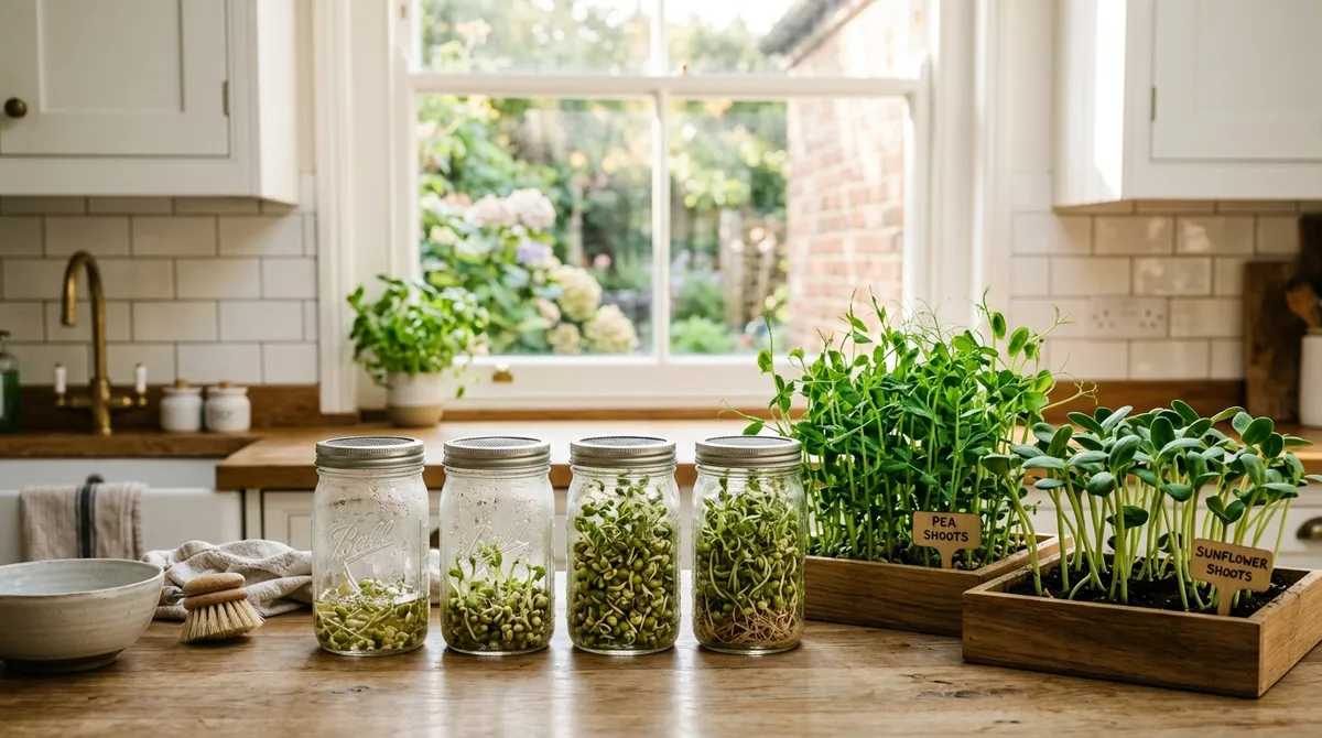 This guide covers the five most reliable crops: mung beans, alfalfa, fenugreek, pea shoots and sunflower shoots. It is the method I actually use, tested through three UK winters.