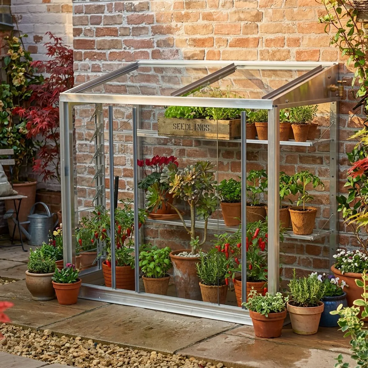 The Access Harlow Mini Lean To at £349 is a popular entry point. It measures 2x3ft with toughened glass panels and a hinged door. Lean-to frames work best against a south-facing brick wall where they capture morning and afternoon sun.