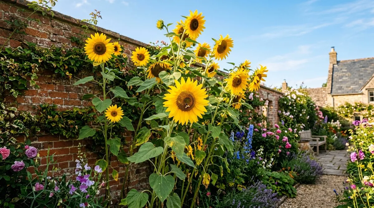 Wind is the main enemy of tall sunflowers. A sheltered position against a wall or fence protects stems from snapping. Stake all varieties over 1m tall from an early stage. In exposed gardens, choose multi-headed or dwarf varieties that resist wind damage.