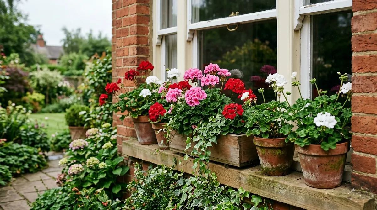 Window box display formula: Plant one upright zonal at the back, one trailing ivy-leaved at each end, and fill gaps with scented-leaf varieties. This gives height, cascade, and fragrance from a single box. Use a window box at least 20cm deep and 60cm wide.