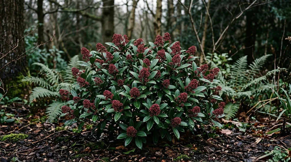Skimmia is one of the finest evergreen shrubs for shaded UK gardens, producing glossy foliage, fragrant spring flowers, and bright red winter berries on acid soil with minimal care. It thrives in conditions where most shrubs struggle, making it indispensable for north-facing borders and woodland planting.