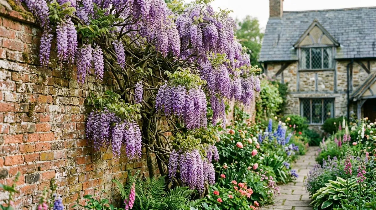 Wisteria is the most dramatic of all British garden climbers. Long racemes of scented purple or white flowers hang in May and June, and the gnarled woody stems develop real character with age. Chinese wisteria (W. sinensis) twines anticlockwise; Japanese wisteria (W. floribunda) twines clockwise. Always buy grafted plants, as seed-grown wisteria may take 15-20 years to flower. Our guide on how to grow wisteria covers the essential two-prune system in detail.