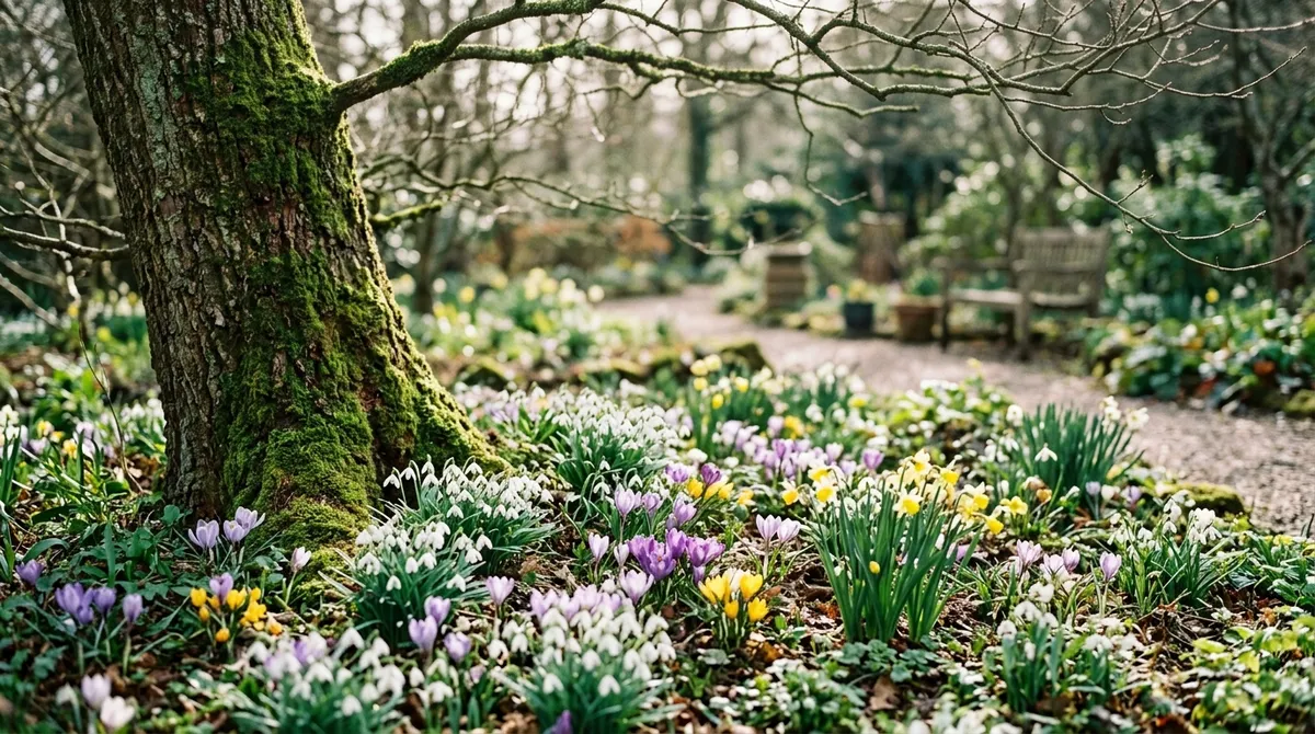 Layer four plant types with overlapping flowering periods. Start with early bulbs (crocuses, early daffodils) for February-March. Add mid-season bulbs (late daffodils, mid-season tulips) for March-April. Plant late-season tulips for April-May. Use flowering shrubs (forsythia in March, magnolia in April) for height. Include perennials (hellebores and primroses) for shaded gaps. This four-layer approach gives continuous colour for 14 weeks without bare periods.
