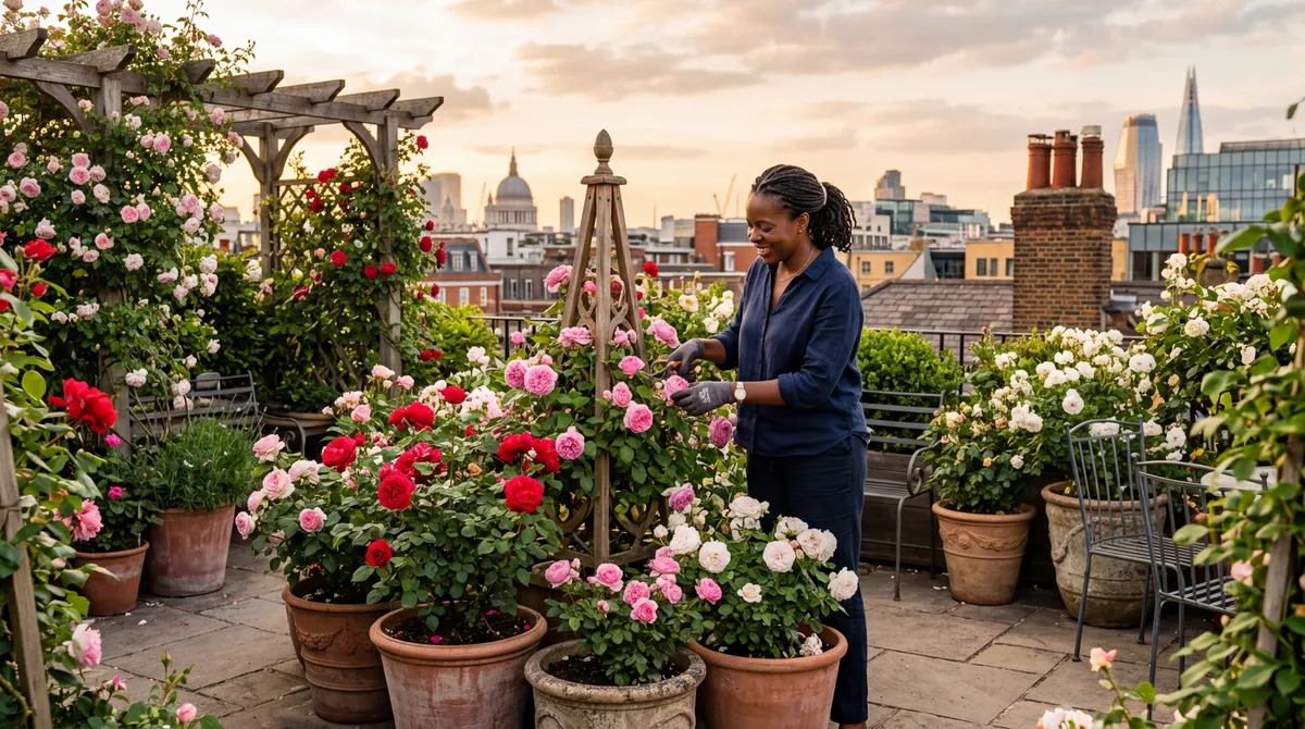 Container roses on a city rooftop terrace. Terracotta and stone pots give the weight and stability roses need.