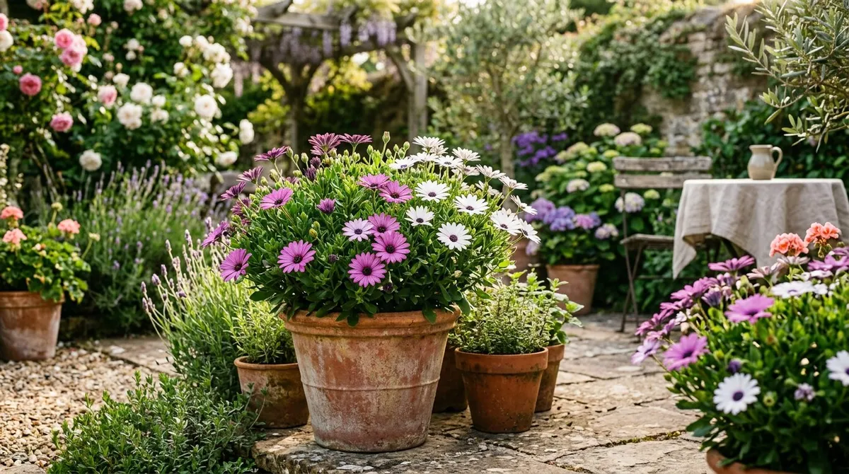 For container planting, use peat-free multipurpose compost mixed with 20-30% grit or perlite. A pot at least 30cm wide gives one plant room to spread. Ensure the pot has drainage holes — sitting in a saucer of water kills osteospermum faster than frost. Container growing is particularly effective on balconies where the warmth from building walls offers extra frost protection.