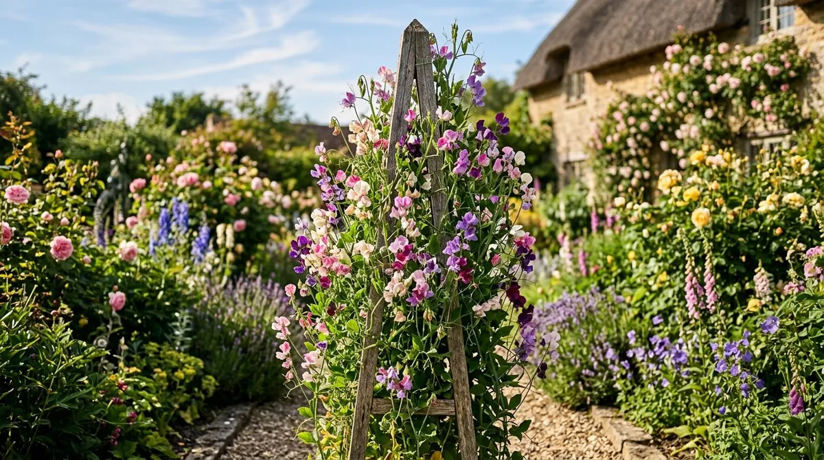 Sweet peas attract bees, butterflies, and hoverflies, making them valuable for bee-friendly garden planting. Grow them alongside other cottage garden favourites such as lavender, roses, cosmos, and foxgloves for a border that buzzes with life all summer.