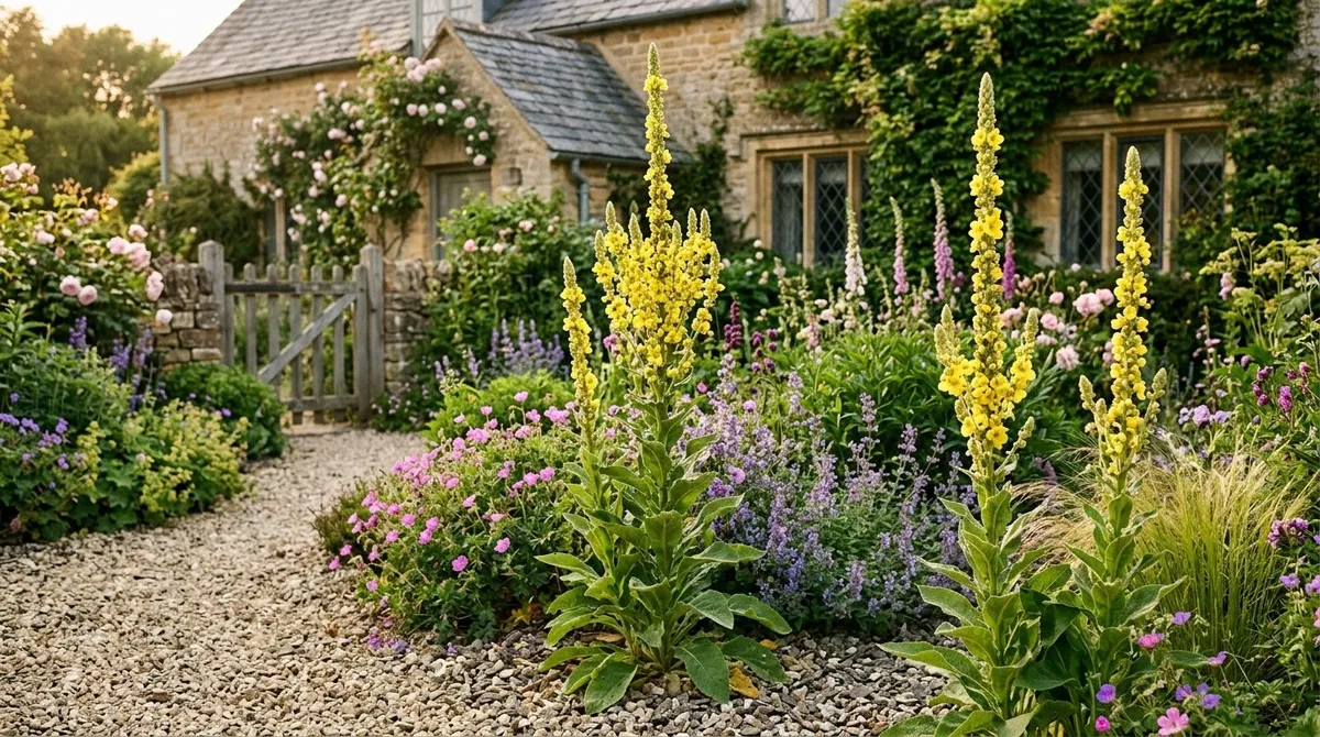 Verbascum is one of the defining plants of the gravel garden style. Its rosettes sit naturally among stone, and the flower spikes provide height without needing staking. Plant with lavender, alliums, eryngium, and ornamental grasses for a low-maintenance, drought-tolerant scheme.