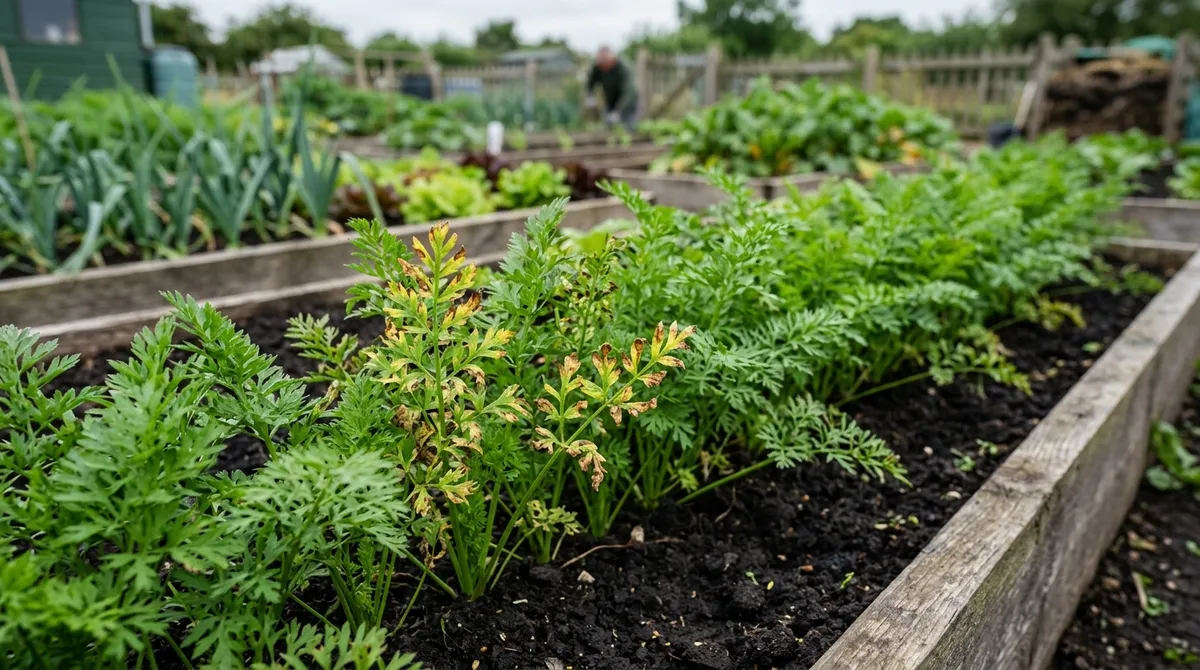 Yellowing carrot leaves are often mistaken for nitrogen or magnesium deficiency. The key difference: nutrient deficiency causes uniform yellowing across the leaf, while blight produces distinct dark spots with defined margins. Feeding a blighted crop with nitrogen fertiliser actually worsens the problem by producing lush, soft growth that is more susceptible to infection.
