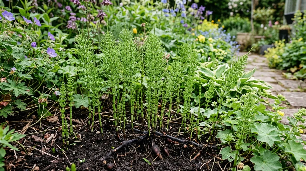 This depth problem eliminates physical removal as a practical strategy for any established infestation. Digging stimulates horsetail rather than removing it — disturbing the rhizomes breaks them into fragments, each with viable tubers, while simultaneously improving aeration and drainage around the remaining root system.