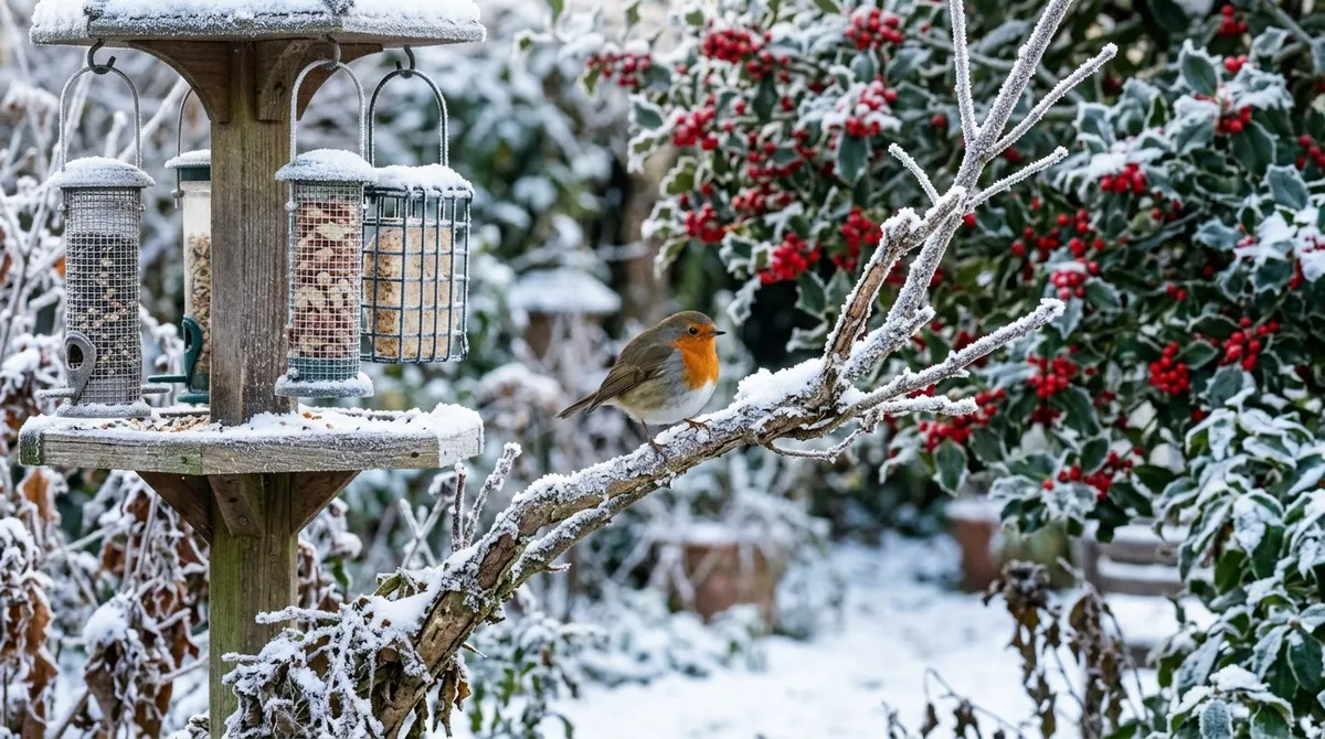 A well-stocked feeding station in a winter wildlife garden. Feed twice daily, with the afternoon fill before dusk being the most important.